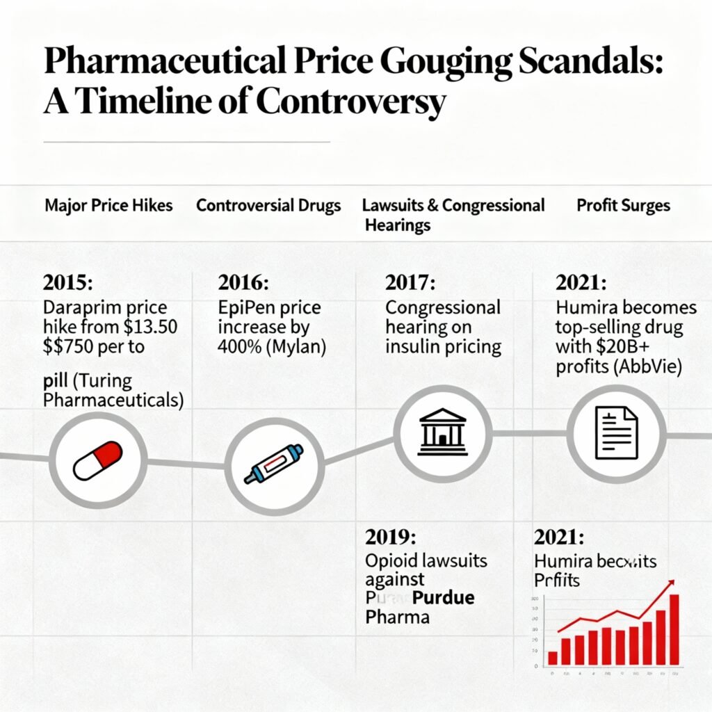 infographic timeline of, “Pharmaceutical Price Gouging: Big Pharma’s Hidden Profit Scandal”